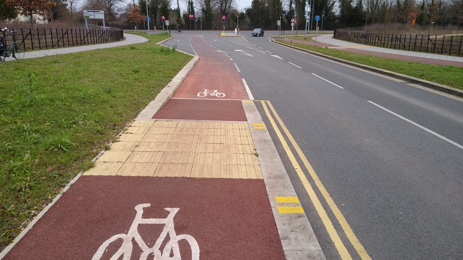The red arrows show the crossfall towards some road gullies. As one cycles along, the crossfall is to the left. As one passes the first gully, the cycle track then bends left at the start of the bypass and so one will tend to lean left to counteract the forces pushing out to the right. However, in a very short distance, the crossfall switches to the right as the cycle track bends to the right. The problem is, the tricycle tilts to the right, but unless one corrects shifts the lean from the left to the right quick enough, one risks falling off to the left.