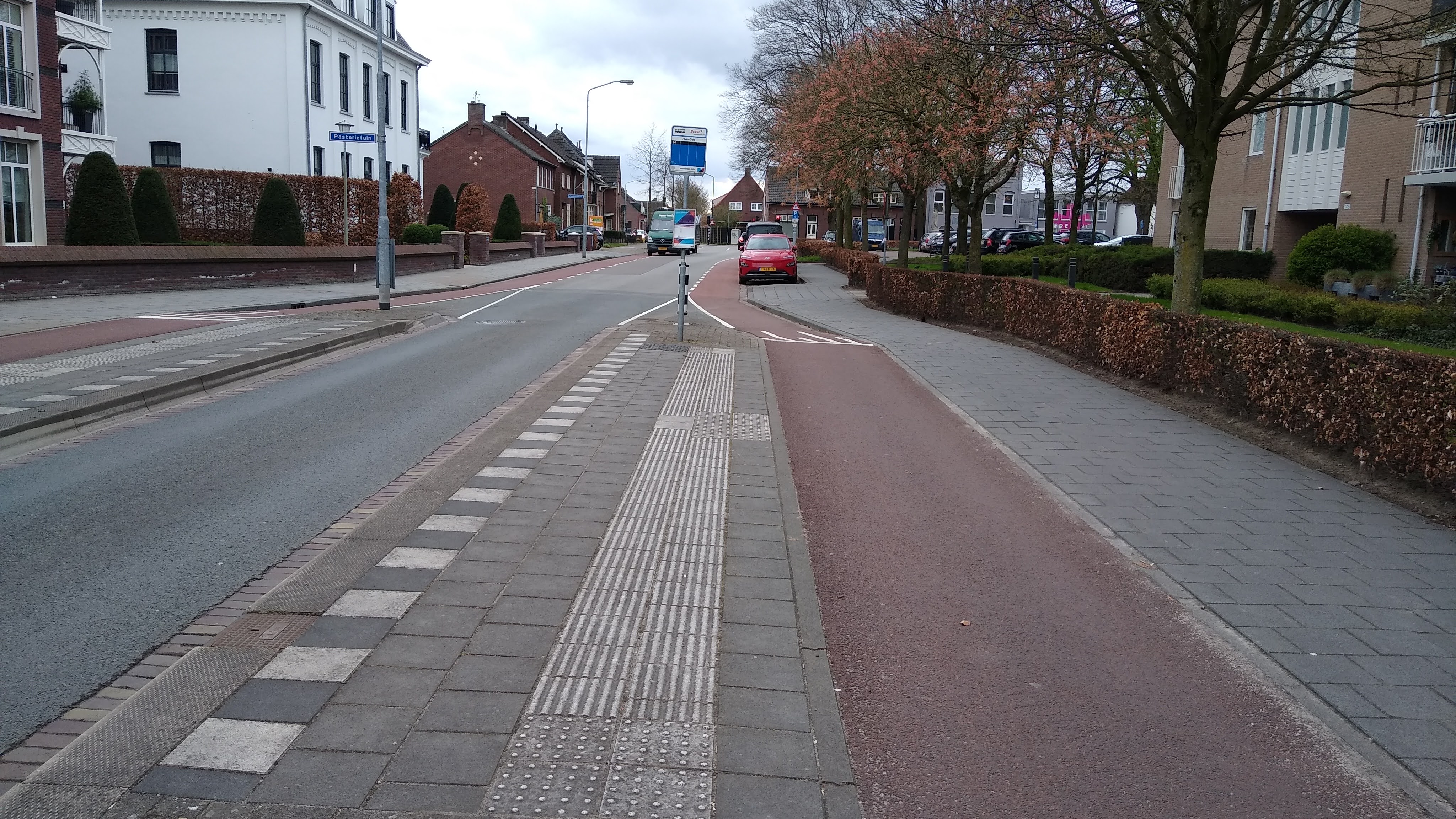The location was on a much longer distributor style which runs parallel to a main through route, both of which run to the town centre. The route the bus stops are on is residential, quite suburban and although traffic calmed, it felt more like a British rat-run that a quiet Dutch street.